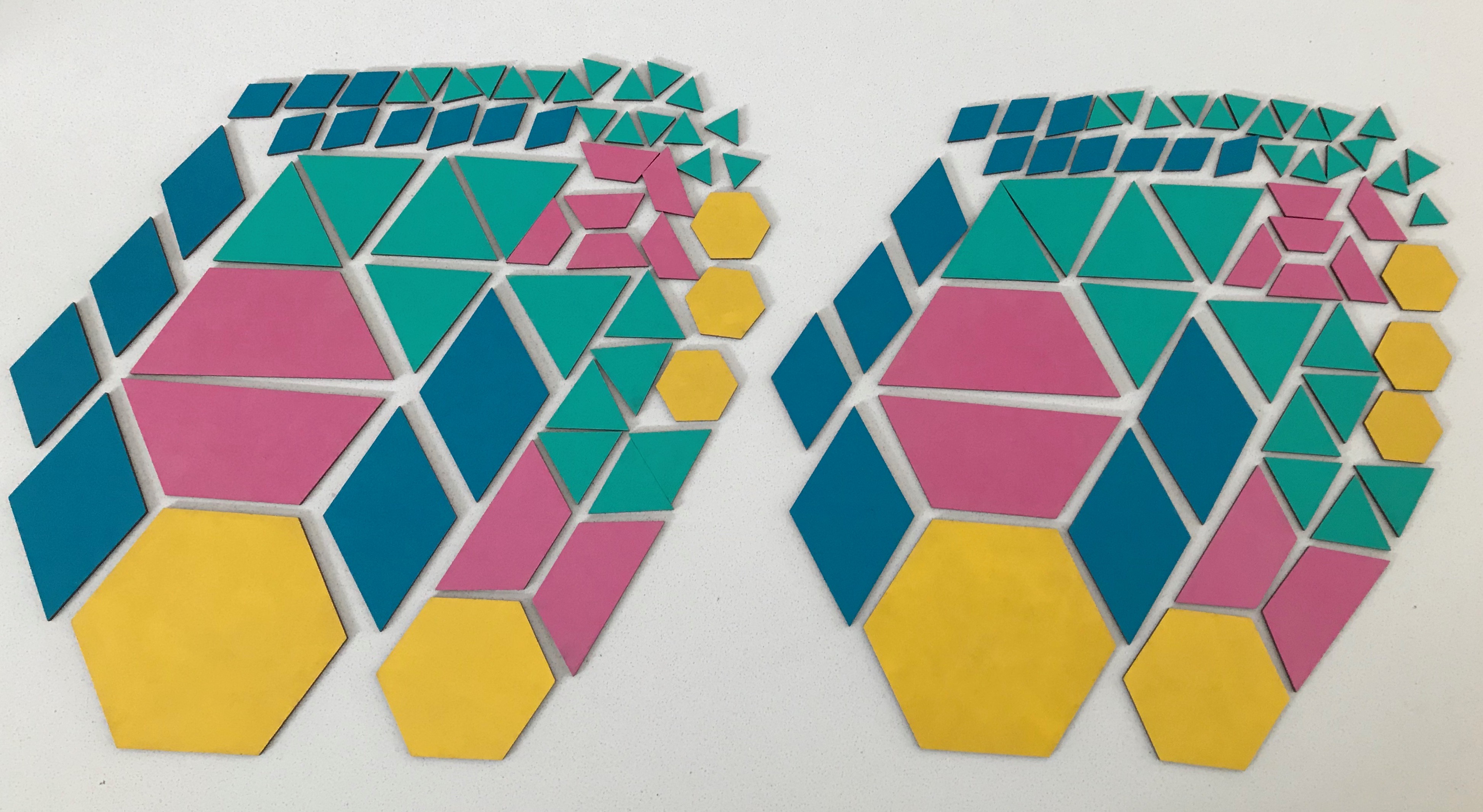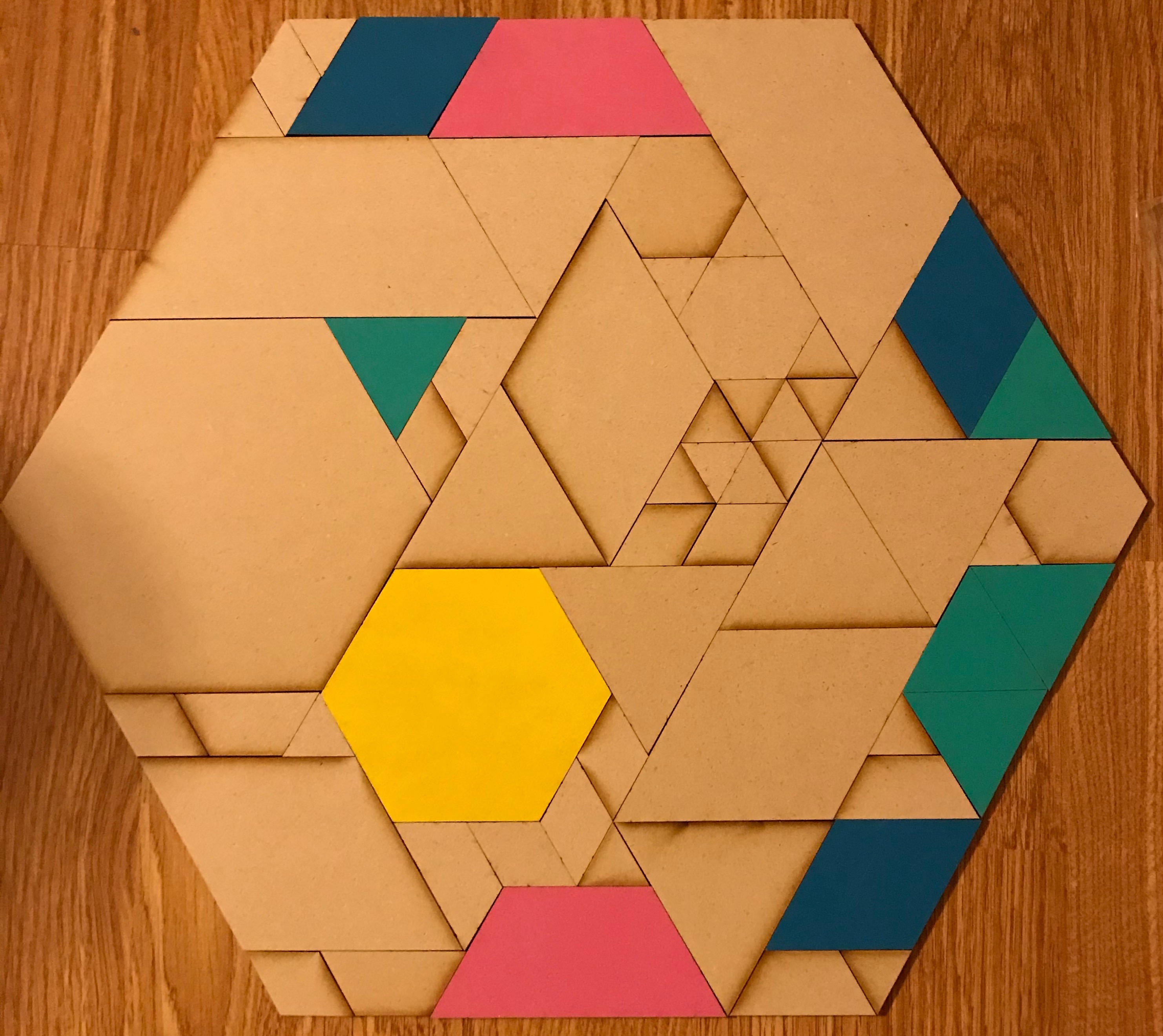 The first two sets of “Up_scale_ Pattern Blocks” are imaged below on the left. A single set is composed of three sizes of tiles, and can be arranged into a single eight-times scale model of the yellow hexagon. One such possible arrangement (pre-painted) is pictured on the right.