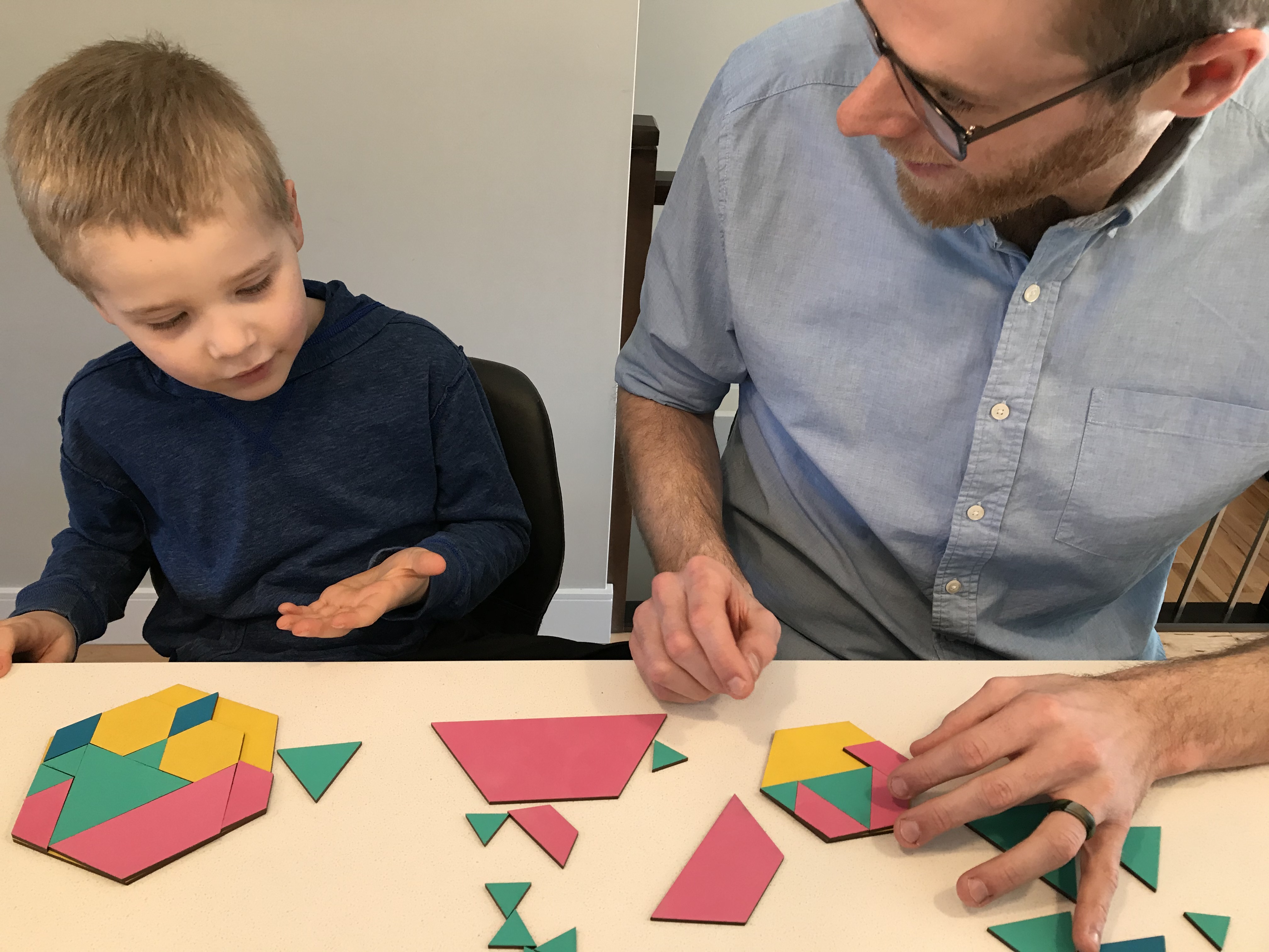 (If you are not familiar with Math for Love, poke around the website. Along with the Upscale Pattern Blocks, there are numerous other curiosities for home-based and school-based mathematical exploration.)